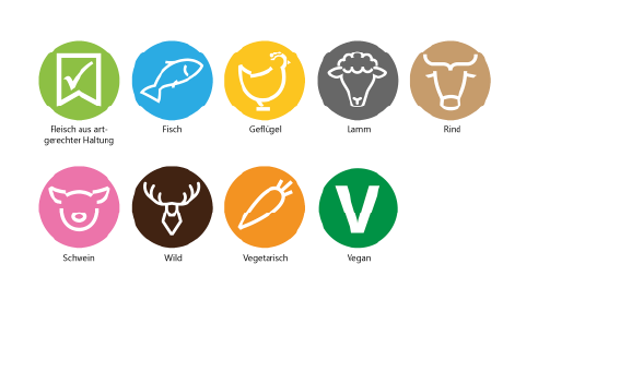 Ist mein Gericht vegetarisch oder vegan? Oder welche Fleischsorte ist enthalten? Diese Fragen werden über die verschiedenen Icons in unserer Übersicht beantwortet