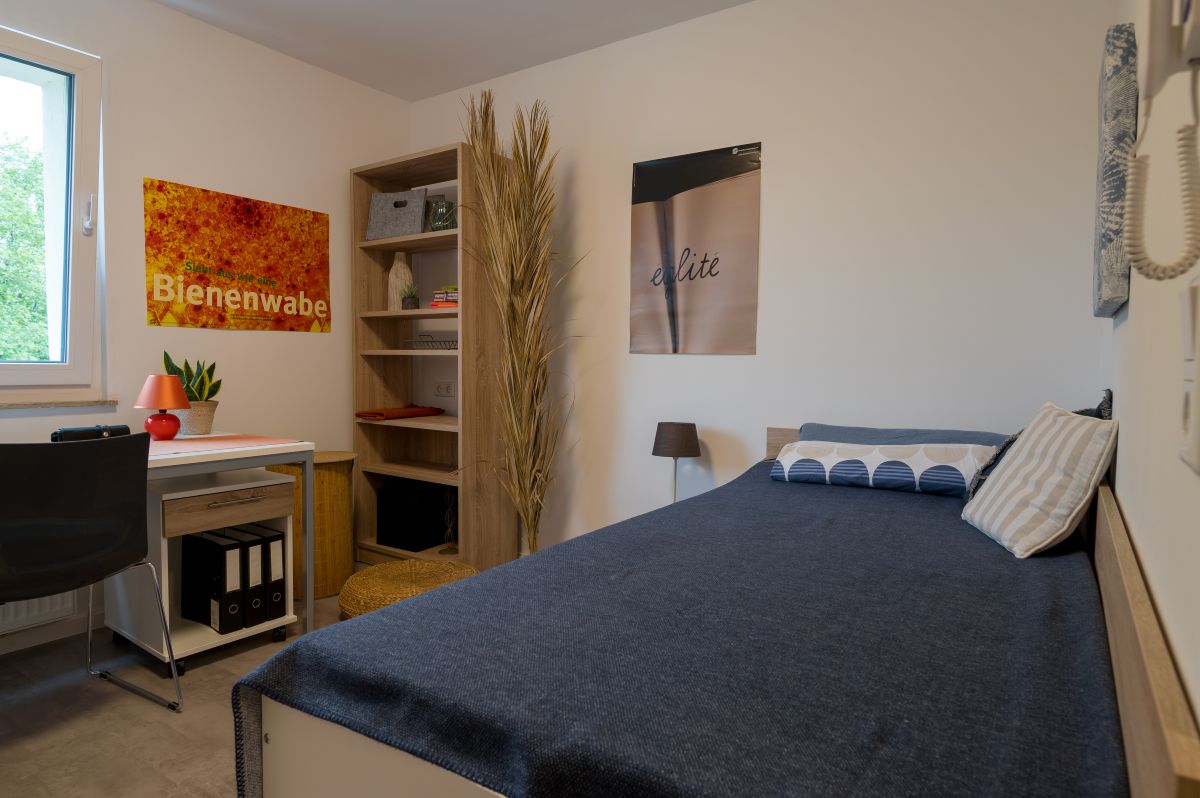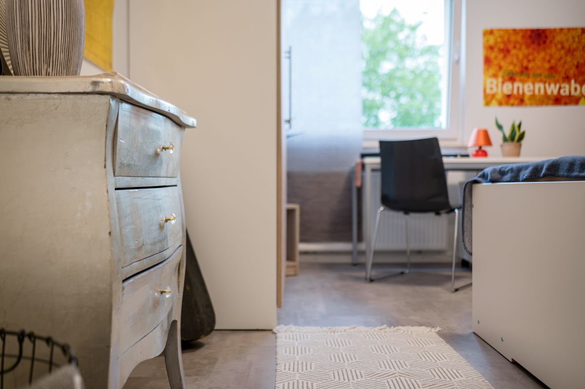 In dieser Bildergalerie haben wir einige Wohnbeispiele zusammengestellt. Es handelt sich um ein Originalfoto aus dem Haus. Wir vermieten alle Zimmer grundsätzlich mit Bett, Schreibtisch, Tisch und Stuhl. WG-Küchen sind mit Küchenzeile und Sitzmöglichkeiten ausgestattet. Deko, Textililien und natürlich auch persönliche Gegenstände sind nicht mit dabei und können nach Geschmack selbst ausgewählt werden.