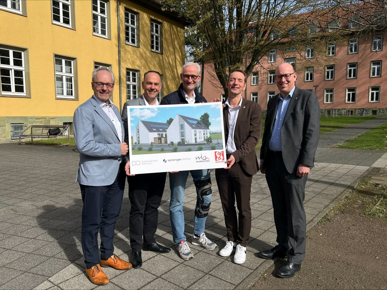 Zusammen mit der Sprenger-Unternehmensgruppe starten wir ein zukunftsweisendes Wohnprojekt: In der Hamburger Straße 25–27 in Soest entsteht eine moderne, energieeffiziente Wohnanlage mit 50 öffentlich geförderten Wohnheimplätzen für Studierende der Fachhochschule Südwestfalen. Der Neubau ersetzt eine Alt-Immobilie, die abgerissen wird. Das Bauvorhaben wurde heute der Öffentlichkeit vorgestellt.